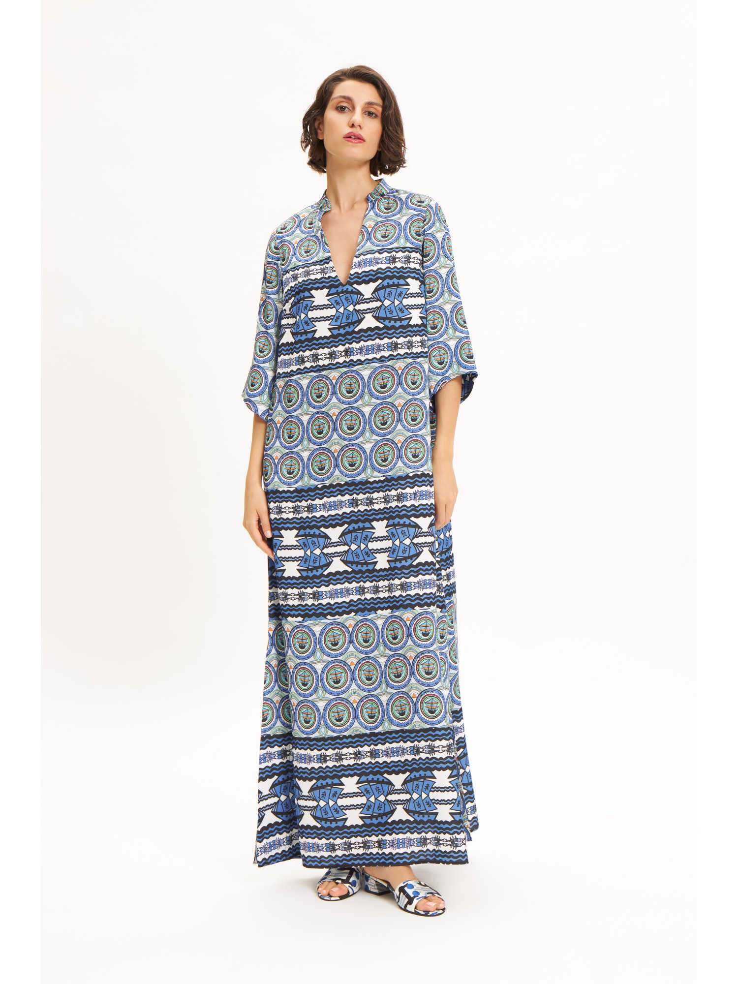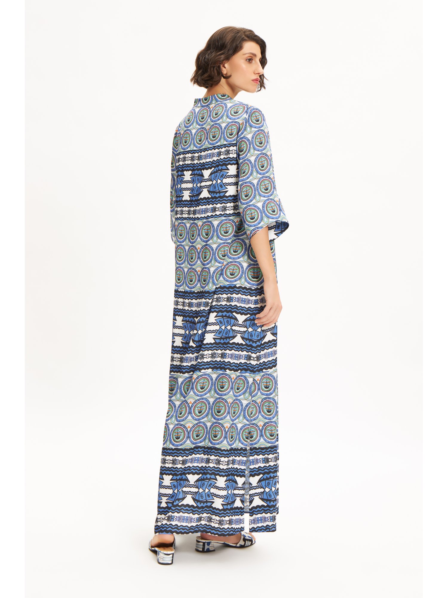 | Highlights | LONG LENGTH| KIMONO STYLE | BELT TIE | BUTTON FASTENING | STRAIGHT HEM| HANDMADE IN GREECE |